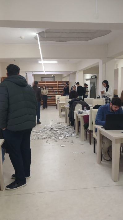 Sinop Üniversitesi Kütüphanesi’nde, akşam saatlerinde meydana gelen olayda, edinilen bilgilere göre kütüphanenin tavanının bir bölümündeki sıvalar, henüz belirlenemeyen bir sebeple çöktü.