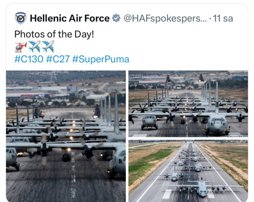 Yunanistan Hava Kuvvetleri‘nin sosyal medya hesabında, “Günün fotoğrafları!” notuyla C-130 uçağına ait görüntüler paylaşılırken, paylaşım kısa sürede büyük tepki topladı. Gelen tepkilerin ardından söz konusu içerik silindi.