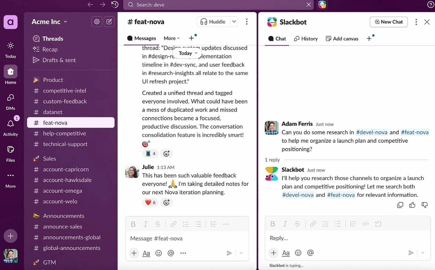 The Verge’in gördüğü bir demoda Slack, yeni yapay zekâ destekli Slackbot’un nasıl daha karmaşık görevleri yerine getirdiğini gösterdi. Örneğin, farklı kanallardaki bilgileri bir araya getirip bir ürün lansman planını Canvas içinde düzenleyebiliyor veya markanın diline uygun bir sosyal medya kampanyası tasarlayabiliyor.